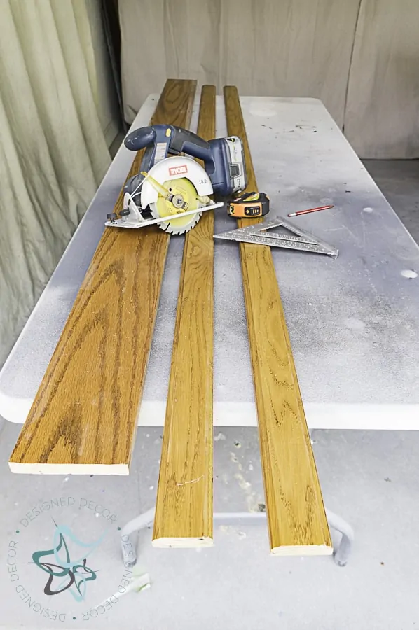 We used the leftover oak wood from the wall we removed in our dining room. Thankfully my pieces were the right width, I just needed to cut the length. I was also thrilled that the edges were routered so it will give my ledge a finished look.