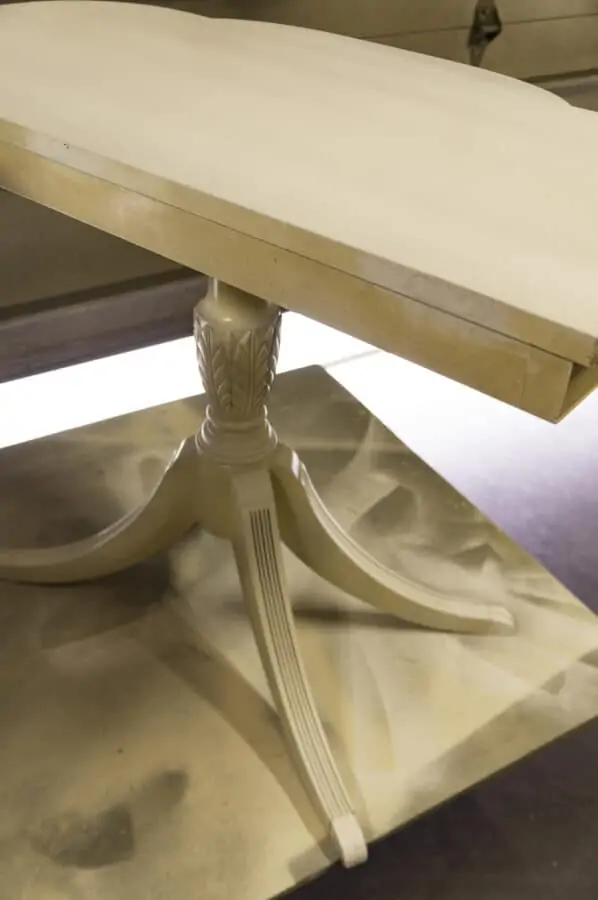 This dark stain finish is screaming to be painted black since it had paint bleed through. I began to paint the table a light color and immediately she began to bleed. Read this post if you want to learn how to stop paint bleed through.