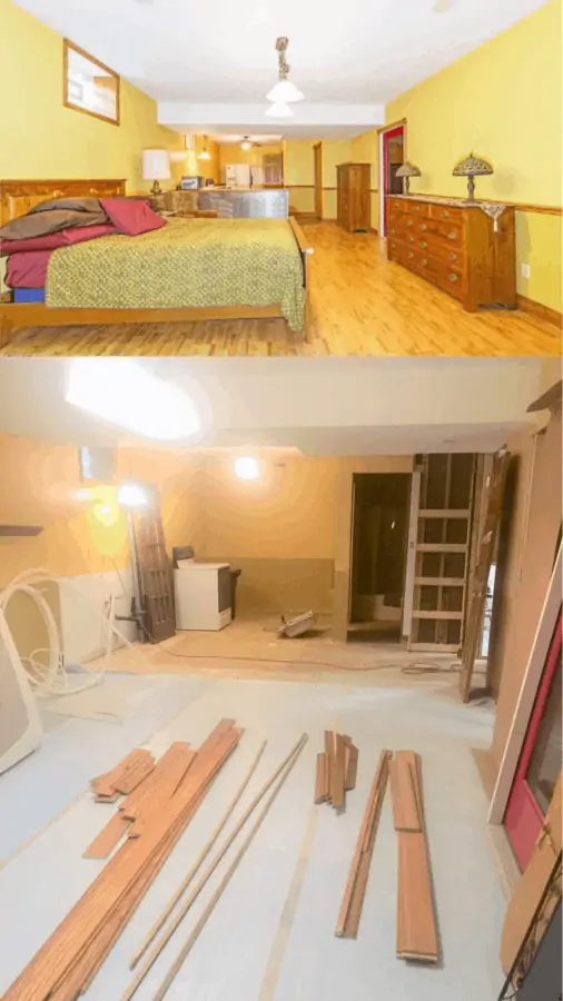 The top portion of this photo was how this space looked when they staged the house for sale. And how it looks today after starting a renovation and #demoday.