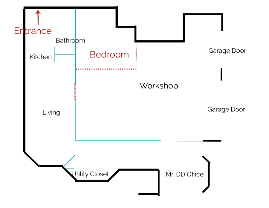 See the changes in “red” This was our first plan for HOF Hideaway. We were adding an entrance and taking a small portion of my workshop to add a bedroom.