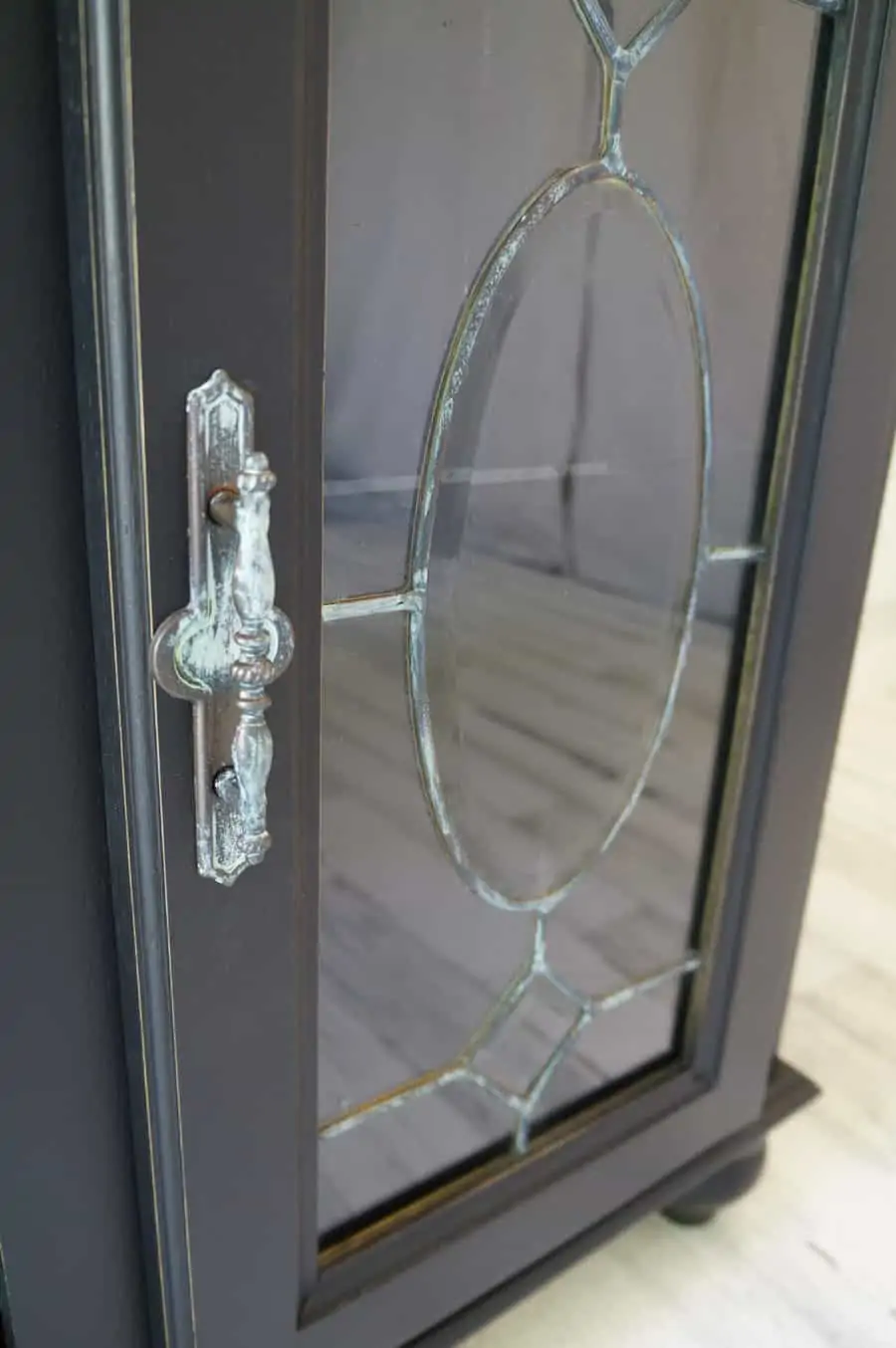 The lead on the glass door was exposed to water and was already starting to rust and patina when I bought it. I decided to continue the patina effect and carry that effect to the wood wine holder and the hardware. I knew the patina would stand out and contrast with black paint. So this is how inspiration struck.